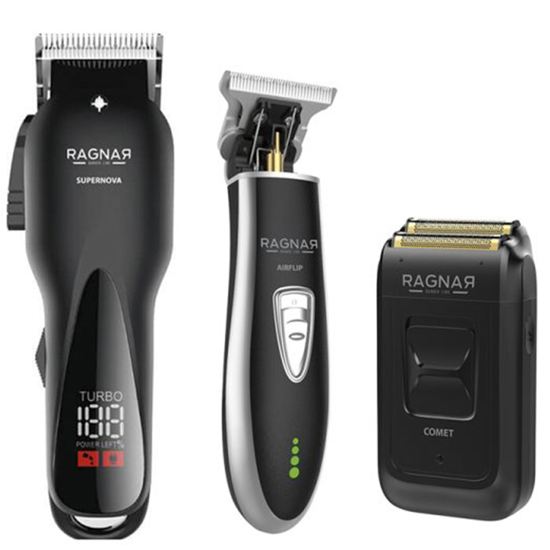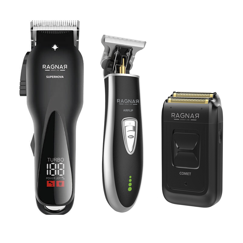 El pack Ragnar Supernova + Airflip + Comet es un kit completo de barbería profesional diseñado para cubrir corte, definición y apurado con equilibrio y comodidad. Una combinación pensada para el trabajo diario con herramientas fiables y fáciles de controlar.Pack clipper trimmer shaver ragnar profesional 2026